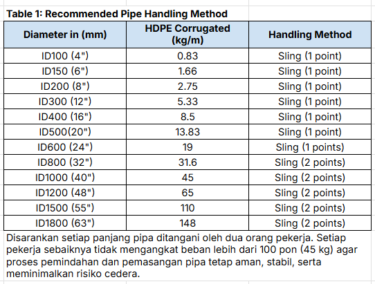 Selalu rujuk pada Tabel Recommended Pipa Handling Method sesuai rekomendasi pabrikan.